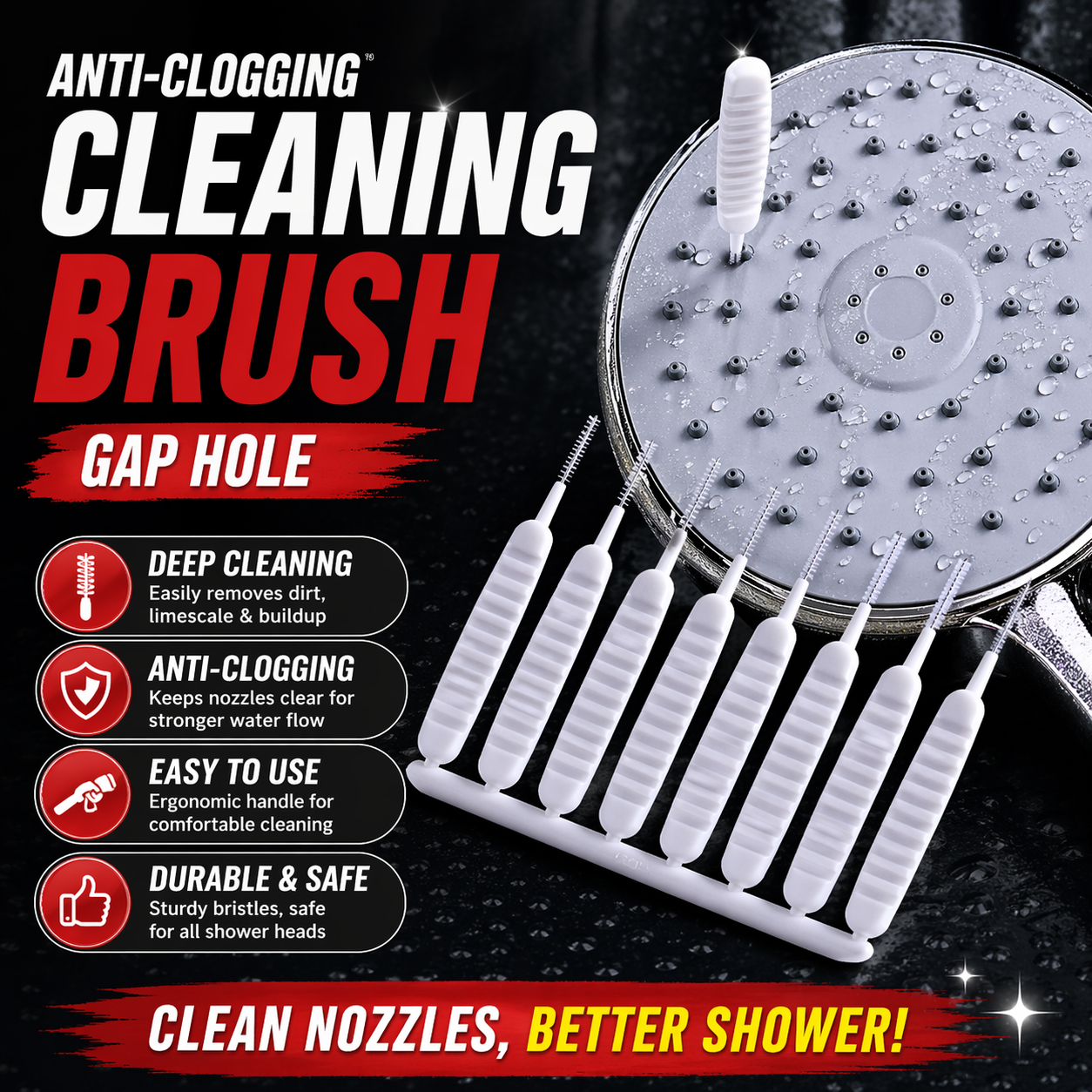 I was curious about this product, because I live in a motorhome with both an indoor and outdoor shower facility. As such, their shower heads are, well, very cheaply made. Some ten plus years old, the range and effectiveness of their flow pattern adjustability was weakened with clogged orifices. The inside head appeared to suffer from build up of minerals from hard water, and the outside, from that, and a tendency to acquire algae coatings, if unused for long periods. Normal cleaning methods don't free the holes from any of that, and I can imagine, more difficult clogs from any larger contaminants in the water.Unlike the shower head featured in the product ad, there are two different spray methods in my heads, one for true shower, and one for massage.
